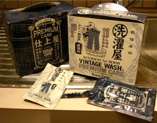Sugar Cane vintage wash & Premium care enzyme detergent for Denim. Carton with 10 sachets of Vintage wash & Premium Care. Prepare cold water or luke-warm water more than 30L, in an adequately large container (best not over 20 degrees Celsius, DO NOT WASH IN HOT WATER. By washing in hot water, the indigo blue dye will lose its natural shade. Mix the detergent with water. If you are worried about excessive indigo loss usually not a problem with Japanese makes, then add a table spoon of salt to help the indigo hold fast please no sea water, you dont know whats in there. Add jeans & let it sit in the water for 20 minutes. After about 2 minutes in the water, the enzymes in the vintage wash is already starting to take effect will notice the water becoming murky. Hand wash the jeans. Rinse your jean with cold water and ensure all the detergent is washed away. Add the Sugar Cane premium care solution to water and soak the jeans in it for 15 minutes, then proceed to drying do not rinse out the treatment solution. Dry your jeans in the shade and NOT direct sunlight to avoid fading in the sun.